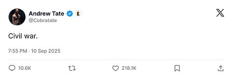 The loudest online right-wing reactions went further. Chaya Raichik, the founder of the anti-LGBTQ group "LibsOfTikTok" posted, "THIS IS WAR." Elon Musk called the left "the party of murder." Laura Loomer, a conservative influencer who is considered an unofficial advisor to the President, said that the administration should "shut down, defund, and prosecute every single Leftist organization." Andrew Tate, another high-profile conservative voice, called for civil war. Even Stephen Miller, the President's Deputy Chief of Staff, chimed in. These aren't anonymous troll accounts; these are people with real megaphones and power. What they're exhibiting isn't leadership in this moment – it's pouring gasoline on the fire.